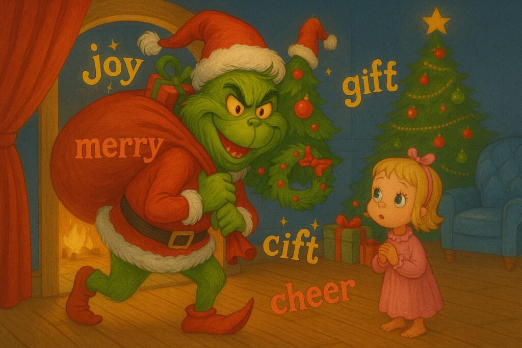 Deca prave božićne ukrase i magične predmete, a da bi spasili Božić, moraju rešiti zagonetke i pronaći ključ Grinchove brvnare koristeći engleski.